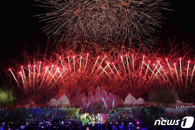 (순천=뉴스1) 전원 기자 = 2023순천만국제정원박람회가 개막한 31일 전남 순천시 동천에 마련된 수상 특설무대에서 열린 개막식에서 불꽃쇼가 펼쳐지고 있다.(전남도 제공) 2023.3.31/뉴스1