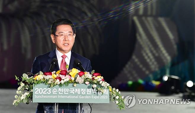 (순천=연합뉴스) 31일 오후 전남 순천시 순천만국가정원에서 열린 '2023 순천만국제정원박람회 개막식'에서 김영록 전남지사가 환영사를 하고 있다. 2023.3.31 [광주전남사진기자단]
