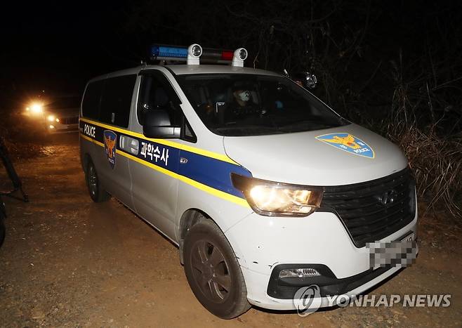(대전=연합뉴스) 이주형 기자 = 여성을 납치 후 살해하고 유기한 혐의를 받는 30대 남성 3명이 긴급 체포된 가운데, 경찰이 31일 오후 대전 대덕구 대청호 인근 야산에서 피해 여성의 시신을 수습한 뒤 조사를 마치고 복귀하고 있다. 2023.3.31