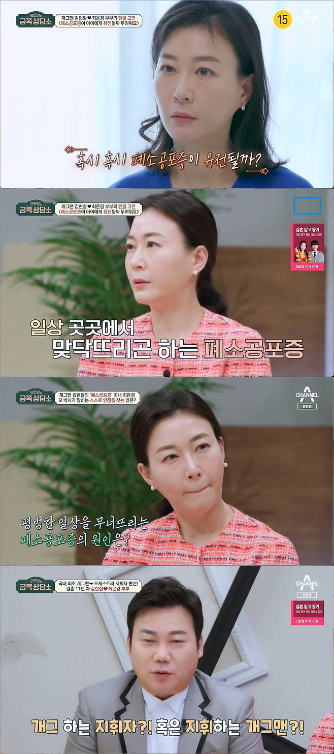최은경의 일상을 흔들어놓은 증상은 공황장애 증상 중 폐소공포증이라고. 최은경은 "'이러다 죽겠다' '이게 죽는 거구나' 싶었다. 해외여행에서 돌아오는 날 귀국 중 폐소공포증이 심하게 와서 비행기에 드러누웠다. 속옷 양말도 다 벗었다. 정신나간 것처럼 보였을 거다"라며 "이것도 유전이 있을까 싶다"라 걱정했다.