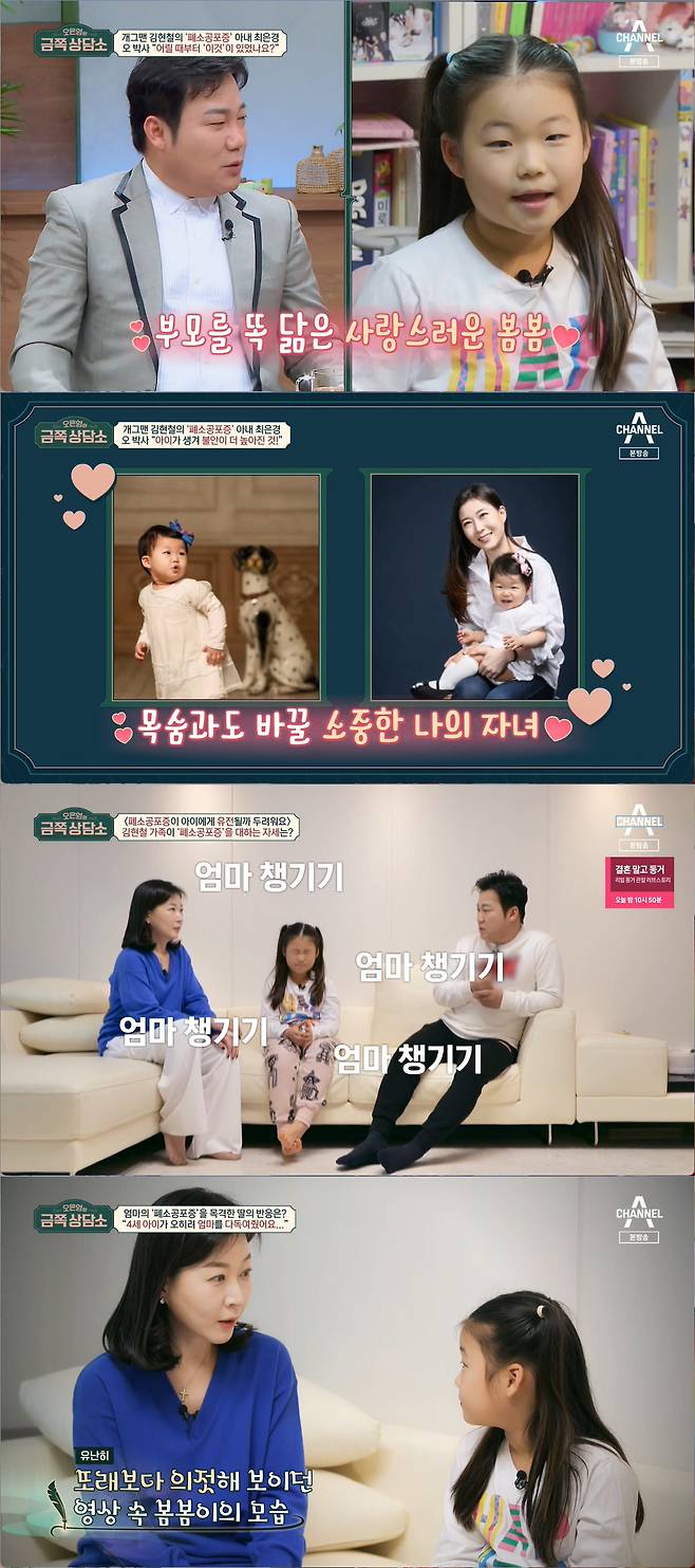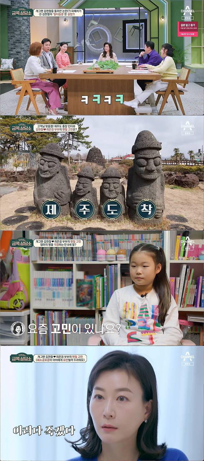 '금쪽상담소' 최초 출장인터뷰는 제주도에 사는 김현철 집에서 진행됐다. 8세 딸 봄봄이는 "엄마한테 그런 병이 있다는 게 무서웠다"라 했다. 김현철은 "아내가 답답한 곳을 못견뎌하고 제주도로 가고 싶다 해서 이사왔다. 4년차가 됐다"라 말을 열었다. 김현철은 "오해의 소지가 많다. 다른 부부의 차를 탈 때 남의 남편 옆 조수석에 가서 앉는다. 난처하다"라 밝혔다.