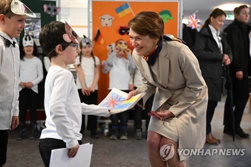 epa10552484 (L-R) Wife of German President Elke Buedenbender receives a gift from a kid during a visit at a school in Hamburg, Germany, 31 March 2023. Britain's Royal Couple is on a three-day tour in Germany for Charles' first state visit as king. EPA/FILIP SINGER