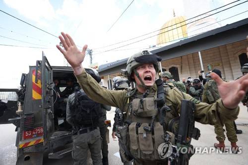 epa10552508 Israeli soldiers take position during a protest to mark the 'Land Day' in Huwara village, near the West Bank city of Nablus, 31 March 2023. Ten Palestinian were wounded during the protest, Palestinian Health Ministry said. The day commemorates the 30 March 1976 events, when marches and a general strike was organized in Arab towns against the Israeli government's decision to expropriate large tracts of Palestinian-owned land for settlement. The annual event calls for the Palestinian right to return to the land they were displaced from after the creation of Israel in 1948. EPA/ALAA BADARNEH