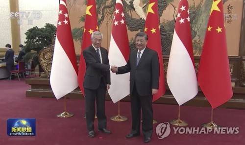 In this image taken from video footage run by China's CCTV, Singapore Prime Minister Lee Hsien Loong, left shakes hands with Chinese President Xi Jinping during a meeting at the Great Hall of the People in Beijing on Friday, March 31, 2023. (CCTV via AP) AP PROVIDES ACCESS TO THIS THIRD PARTY PHOTO SOLELY TO ILLUSTRATE NEWS REPORTING OR COMMENTARY ON FACTS DEPICTED IN IMAGE; MUST BE USED WITHIN 14 DAYS FROM TRANSMISSION; NO ARCHIVING; NO LICENSING; MANDATORY CREDIT, CHINA OUT;, TV OUT