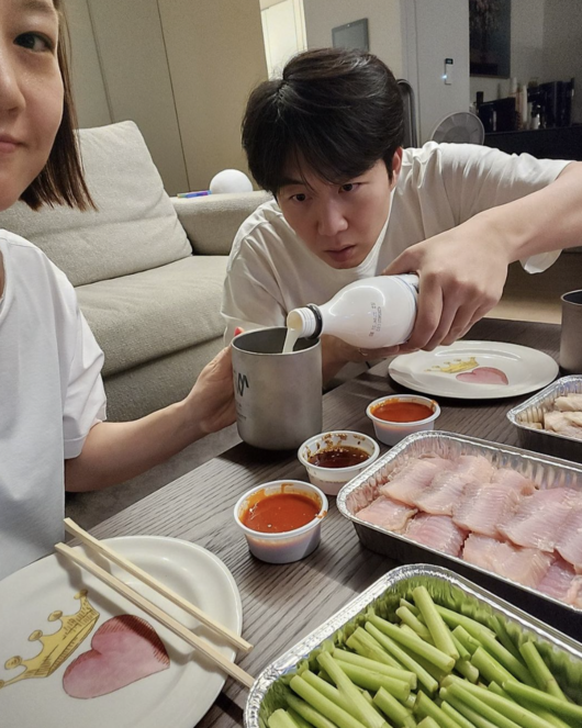 31일, 도경완은 “금요일 저녁엔.. 홍어에 막걸리 한잔.. 크으.."라는 말과 함께 한 장의 사진을 업로드 했다. 사진 속 장윤정은 입술을 꼭 다물고 도경완에게 막걸리를 받아 웃음을 안겼다.