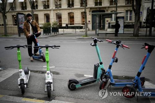 A man parks a scooter in Paris, Friday, march 31, 2023. Romantically zipping two-to-a-scooter, wind in the hair, past the Eiffel Tower and other iconic sights could soon become a thing of the past if Parisians vote Sunday to do away with the 15,000 opinion-dividing micro-machines. (AP Photo/Christophe Ena)