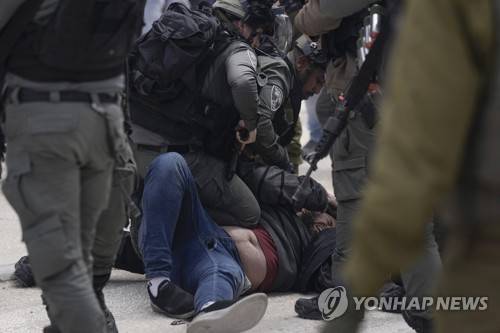 Israeli paramilitary border police arrest a Palestinian during a protest to mark Land Day, and to denounce a February rampage by Israeli settlers, in the West Bank town of Hawara, Friday, March 31, 2023. Land Day is marked annually on March 30 and commemorates the day in 1976 when Israeli security forces shot and killed six Palestinians during demonstrations. It has become a Palestinian occasion to protest what the Palestinians say are discriminatory land policies by Israel. (AP Photo/Majdi Mohammed)