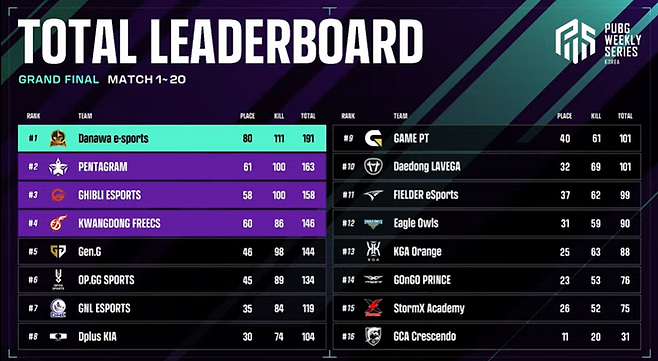 마지막 전투에서 다나와는 이글하우스, 오피지지, FIEL과 치킨 경쟁을 이어갔다. 최종 4팀에서도 킬을 쓸어 담은 다나와는 15킬, 치킨을 뜯으며 압도적인 모습으로 완벽한 우승을 거머쥐었다.