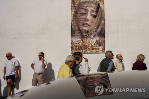 People queue in front of a poster of the Virgin of "Los Dolores" to offer their respect ahead the Holy Week at the Capuchinos square in Cordoba, southern Spain, Friday, March 31, 2023. Hundreds of processions will take place throughout Spain during the Easter Holy Week. (AP Photo/Manu Fernandez)