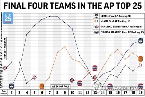 Graphic looks at how the Final Four teams were ranked in the AP Top 25 throughout the season