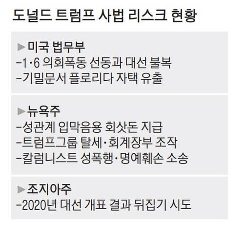 미국 법무부는 트럼프 전 대통령의 백악관 기밀문서 플로리다 자택 반출과 1.6 의회폭동 선동 혐의를 조사 중이고, 뉴욕주 검찰은 트럼프 그룹의 탈세 혐의를 들여다보고 있고, 조지아주 검찰은 트럼프 전 대통령의 2020년 대선결과 뒤집기 시도 의혹을 확인하고 있다.