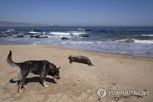 epa10553060 A dog sniffs near the carcass of a dead sea lion at Renaca beach in Vina del Mar, Chile, 31 March 2023. Chile Government reported that 1,535 sea lions and 730 Humboldt penguins have died to date as a result of the avian influenza virus, mainly in northern regions. The Chilean Ministry of Health notified this 29 March the first human case of bird flu in a 53-year-old man. EPA/ADRIANA THOMASA