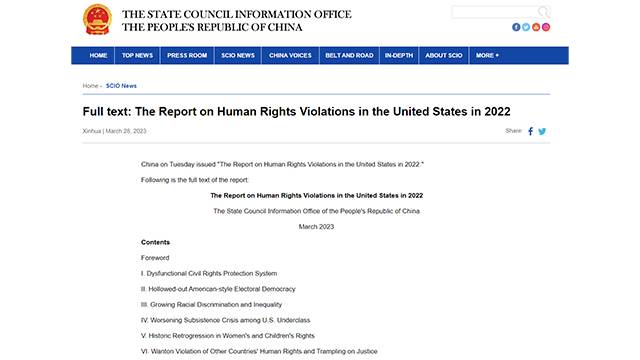 지난달 28일 중국 국무원 신문판공실은 <2022년 미국 인권침해 보고서>를 홈페이지에 게재했습니다.