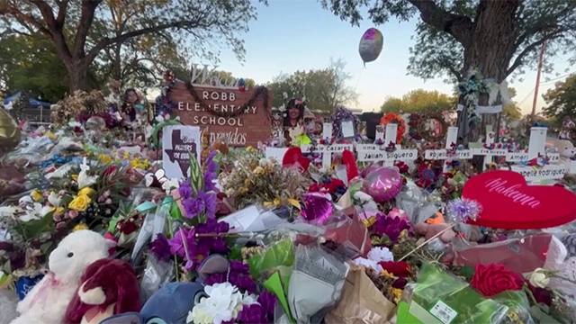 총기난사 사건이 발생한 미국 텍사스주의 롭 초등학교에 희생자들을 추모하는 꽃다발과 인형이 놓여있다.