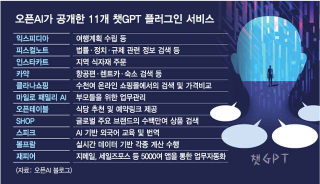 오픈AI의 블로그에 따르면 현재 챗GPT 플러그인에는 11개 기업 서비스들이 올라와 있다. 항공편·렌트카 및 호텔 예약을 가능하게 해주는 '익스피디아' '카약' 등 앱을 비롯해 식자재 주문 앱인 인스타카트, 식당 추천 앱인 '오픈테이블' 등이 있다.