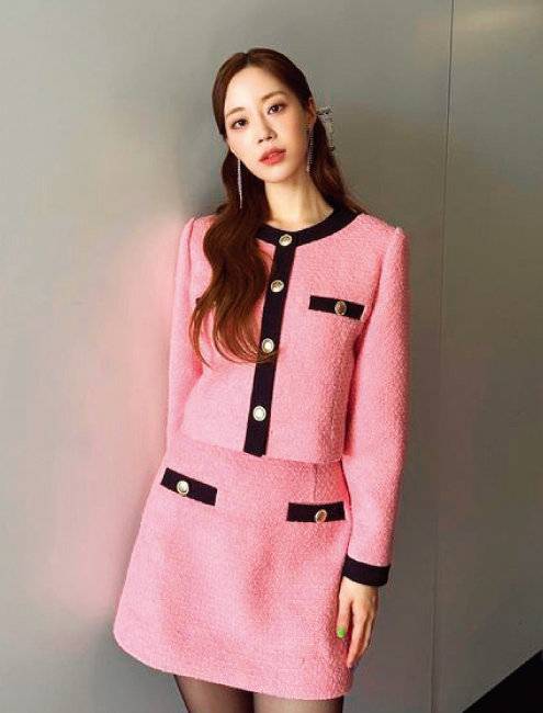 핑크색 트위드재킷과 스커트 셋업으로 바비 인형 같은 비주얼을 연출한 허영지.