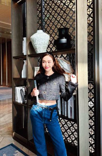 크롭트 트위드재킷의 장점을 적극 활용한 스타일링을 선보인 제시카. 짧은 재킷에 하이웨이스트 데님 팬츠를 매치해 하체가 길어 보이도록 연출했다. 룩이 너무 밋밋하지 않게 허리에 샤넬 코코 리본 체인벨트를 살포시 두른 센스까지 굿!
