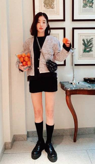 클래식한 트위드재킷과 함께 코디한 이너 티셔츠, 쇼트 팬츠, 니삭스와 슈즈까지 올 블랙 룩을 연출한 기은세. 스타일링이 어려울 때는 이렇게 하나의 컬러로 깔끔하게 통일하는 것도 좋은 방법이다. 초미니 크로스 보디 백으로 귀여운 포인트까지!