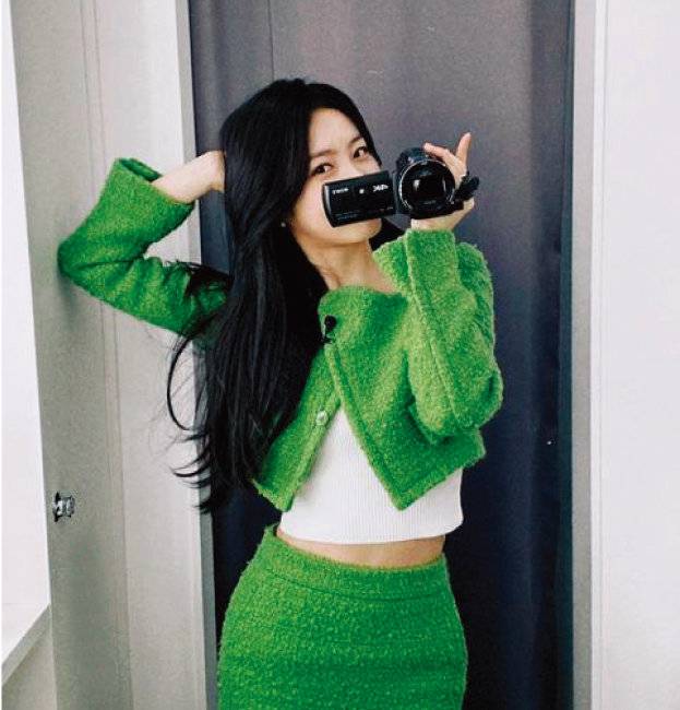상큼한 신예은의 새싹 컬러 포인트 룩. 트위드 셋업만으로 존재감을 드러내고 싶다면 신예은이 입은 것처럼 화사한 컬러를 추천한다. 이때 과해 보이지 않으려면 심플한 디자인을 선택해야 한다는 사실을 꼭 기억할 것. 크롭트 재킷은 넉넉한 실루엣의 데님 팬츠와 매치해도 잘 어울린다.