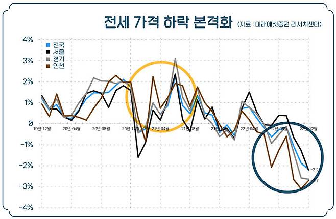 가장 비쌀 때 계약한 전세들이 이제 2년이 됐거나 되어가고 있습니다. 당연히 집주인에게 '전셋값을 내려달라'고 요구할 것이고, 앞으로도 그런 요구는 더 늘어날 건 자명합니다.