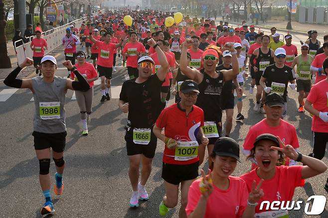 (경주=뉴스1) 최창호 기자 = 1일 경북 경주시 보문단지 일원에서 열린 제30회 경주벚꽃마라톤 대회에 참가한 선수들이 즐거운 보내고 있다. 이번 대회는 약 1만2000여 명이 참가해 하프, 10km, 5km부문에서 열렸다.2023.4.1/뉴스1