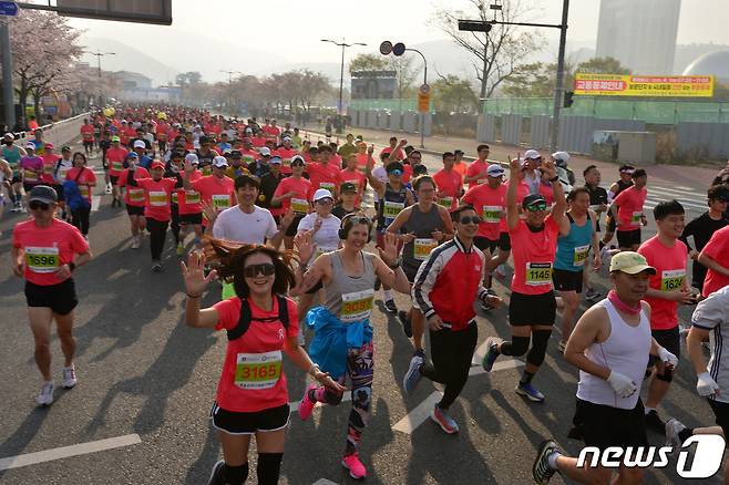 (경주=뉴스1) 최창호 기자 = 1일 경북 경주시 보문단지 일원에서 열린 제30회 경주벚꽃마라톤 대회에 참가한 내·외국인 선수들이 즐거운 보내고 있다. 이번 대회는 약 1만2000여 명이 참가해 하프, 10km, 5km부문에서 열렸다.2023.4.1/뉴스1