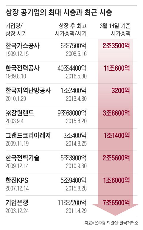 한국전력만의 문제는 아니다. 8개 상장 공기업의 시총은 모두 한때 기록했던 최고치의 절반에도 못 미치는 경우가 많다. 이들 공기업의 개인 주주 118만명은 속이 타들어갈 수밖에 없다.