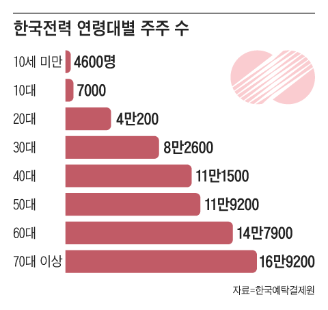 한전 주주의 연령대별 분포를 살펴보면 다른 주식과 달리 고령 주주가 많은 편이다. 70대 이상 주주가 16만9200명으로 가장 많고, 60대 주주(14만7900명), 50대 주주(11만9200명), 40대 주주(11만1500명) 순이다. 30대(8만2600명)나 20대(4만200명) 주주가 많지 않은 편인 것이다. 증권가에서는 “과거 국민주 제도를 통해 주식을 투자한 사람 중에서 주가가 크게 하락하면 ‘비자발적 장기투자’를 하는 사람도 많을 것”이라고 보고 있다.