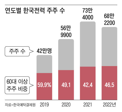 젊은 투자자들에게 그만큼 인기 없는 주식이라는 의미도 된다. 주가 상승을 기대하기 어렵기 때문이다. 한국전력 주주도 2019년 말 42만명에서 2021년 말 73만4000명까지 늘었다가 지난해 말에는 68만2200명으로 다시 줄었다. 60대 이상 주주의 비중도 2019년 59.9%에서 2021년 말에는 42.4까지 낮아졌는데, 작년 말에는 다시 46.5%로 올라갔다.