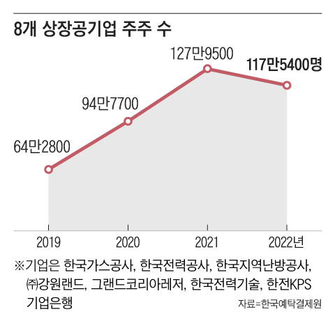 거래소가 국회 정무위원회 박재호 의원(더불어민주당)에게 제출한 자료에 따르면 8개 상장공기업의 개인 주주 수(중복 포함한 단순 합계)는 2019년 64만2800명에서 2021년 127만9500명까지 불어났다가, 지난해 말에는 117만5400명까지 감소했다. 증시 약세에 개인 투자자 수가 줄어든 측면도 있지만, 개인 투자자들이 공기업을 그리 매력적인 투자처로 느끼지 못하고 있는 것이다.