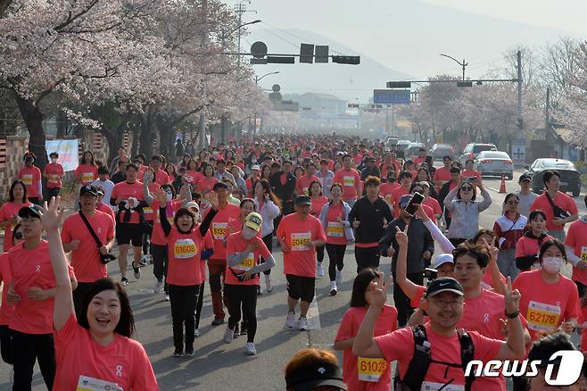 (경주=뉴스1) 최창호 기자 = 1일 경북 경주시 보문단지 일원에서 열린 제30회 경주벚꽃마라톤 대회에 참가한 선수들이 즐거운 보내고 있다. 이번 대회는 약 1만2000여 명이 참가해 하프, 10km, 5km부문에서 열렸다.2023.4.1/뉴스1