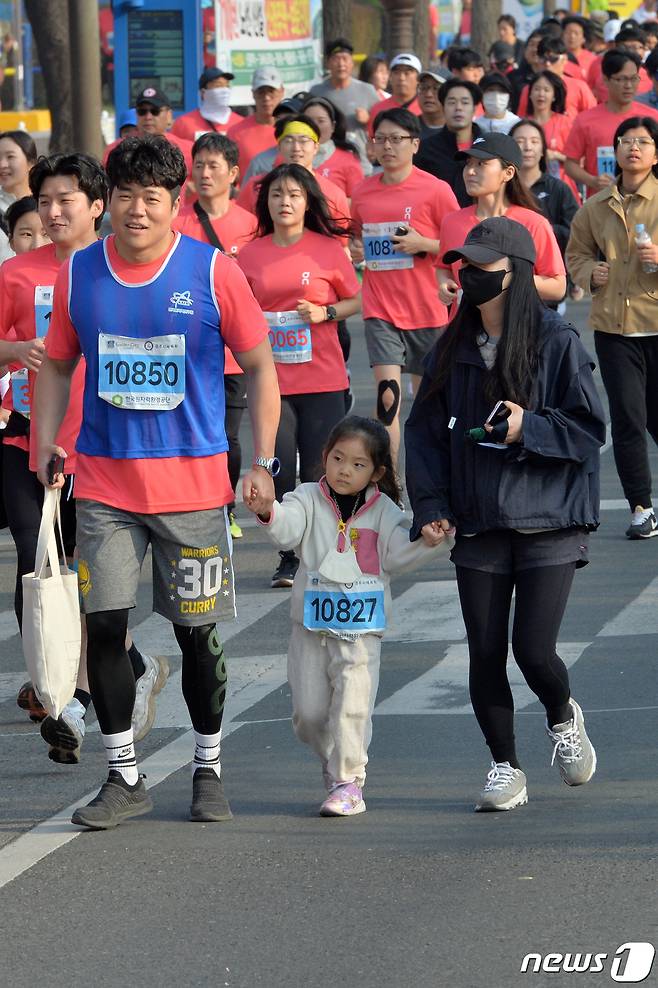 (경주=뉴스1) 최창호 기자 = 1일 경북 경주시 보문단지 일원에서 열린 제30회 경주벚꽃마라톤 대회에 참가한 가족이 달리고 있다. 이번 대회는 약 1만2000여 명이 참가해 하프, 10km, 5km부문에서 열렸다.2023.4.1/뉴스1