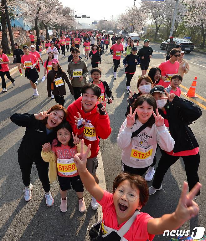 (경주=뉴스1) 최창호 기자 = 1일 경북 경주시 보문단지 일원에서 열린 제30회 경주벚꽃마라톤 대회에 참가한 가족과 선수들이 즐거운 보내고 있다. 이번 대회는 약 1만2000여 명이 참가해 하프, 10km, 5km부문에서 열렸다.2023.4.1/뉴스1