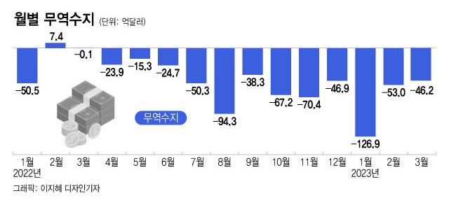 수출은 지난해 10월 이후 6개월 연속 전년대비 감소했고 무역수지 적자 기록은 13개월 째 진행 중이다. 월 수출이 6개월 연속 감소한 것은 코로나19(COVID-19) 확산 초기인 2020년 3∼8월 이후 3년 만이다. 조업일수 24일을 고려한 하루평균 수출액은 23억달러로 전년 동기 대비 17.2% 감소했다.