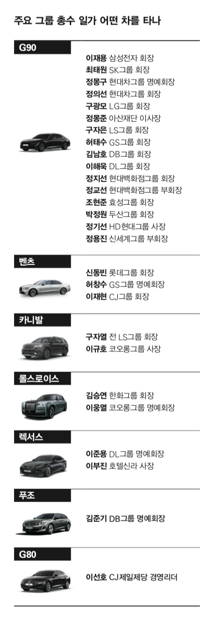 이 밖에도 이재현 CJ그룹 회장은 벤츠 S클래스를 사용하지만, 아들인 이선호 CJ제일제당 경영리더는 현대차의 G80을 직접 운전한다. GS그룹의 경우 허창수 명예회장이 벤츠 S클래스를, 동생인 허태수 회장은 G90을 전용차로 이용한다. 한진그룹의 경우 조양호 선대회장이 벤츠 S클래스를 사용했지만, 조원태 회장은 G90을 이용하고, DL그룹 역시 이준용 명예회장은 렉서스 LS를, 이해욱 회장은 G90을 전용차로 이용하고 있다.