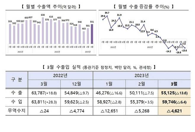 [세종=뉴시스]이승주 손차민 기자 = 3월 무역수지는 13개월 연속 적자를 이어갔다. 우리 주요 수출 품목인 반도체와 최대 수출 시장인 중국에서 고전을 면치 못한 탓이다.