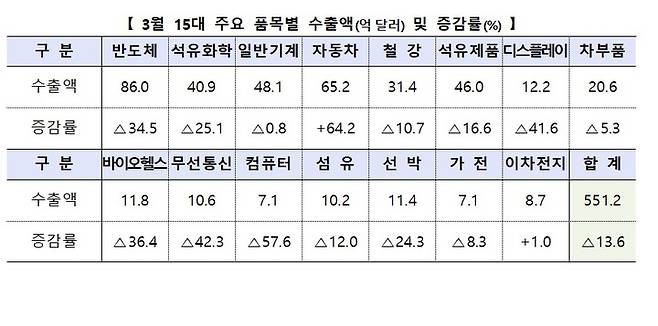 품목별로는 자동차(64.2%)와 이차전지(1.0%)에서는 증가한 반면 반도체(34.5%)와 디스플레이(41.6%) 등 정보기술(IT)에서 큰 폭으로 줄었다. 반도체는 제품 가격 하락으로 인해 감소세가 계속되고 있다.