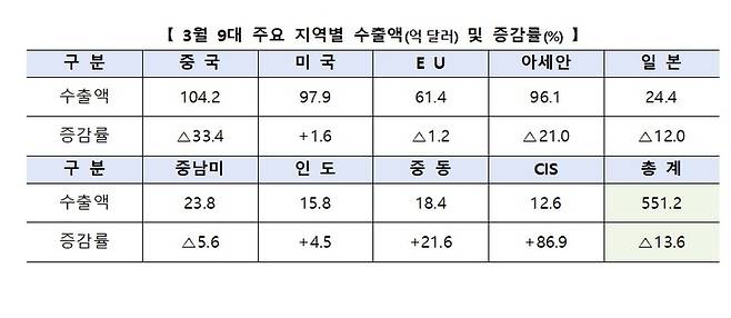 국가별로는 미국(1.6%)과 중동(21.6%) 등에서 늘어났지만 중국(33.4%)과 아세안(21.0%) 등에서는 줄었다. 산업부는 "중국과 아세안에 수출하는 반도체 비중이 높기 때문"이라면서도 "최근 이들 내 최대 교역국인 베트남이 세계 경제 둔화 등의 요인으로 수출입 모두 감소하고 있다는 점도 영향을 미친 것 같다"고 말했다.
