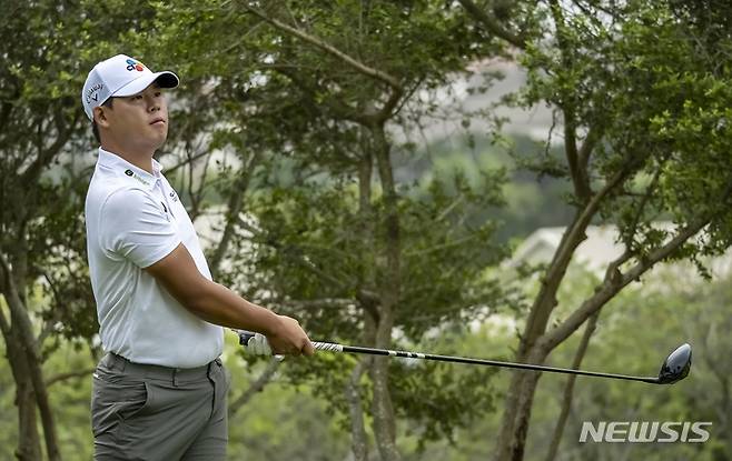 [샌안토니오=AP/뉴시스] 김시우가 지난달 31일(현지시간) 미 텍사스주 샌안토니오의 TPC 샌안토니오 오크스 코스에서 열린 미국프로골프(PGA) 투어 발레로 텍사스오픈 2라운드 18번 홀에서 티샷하고 있다. 김시우는 중간 합계 1언더파 143타로 경기가 마무리되지 않은 현재 공동 49위를 기록하고 있다. 2023.04.01.