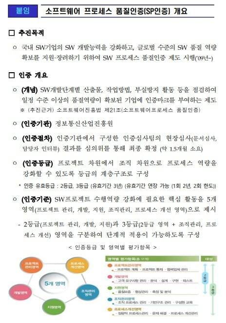 SP인증은 SW진흥법 제21조에 따라 SW의 개발·유지 및 관리 활동 등의 품질향상과 신뢰성 확보를 위해 시행하고 있는 인증제도다. 국내 SW기업의 품질인증 비용부담을 완화하기 위해 미국에서 운영중인 'CMMI(Capability Maturity Model Integration)' 인증제도를 참조해 만든 한국형 모델이다. SP인증 만들때 참조한 CMMI는 미국 카네기 멜론대학 산하 SW 공학연구소가 SW 개발 및 유지보수 프로세스의 성숙도를 평가하기 위해 만든 모델이다.