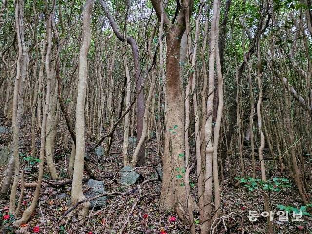 뾰족산은 온통 동백나무가 원시림처럼 우거진 숲이다. 흰둥이가 인도하는 등산로에는 선홍색 동백꽃이 점점이 떨어져 있다. 마치 누군가 ‘꽃길만 걷게 해줄게’ 하면서 나를 위해 준비해 놓은 것 같다. 아침의 동백나무 숲속에서는 수많은 작은 새들이 지저귀며 울어댄다.