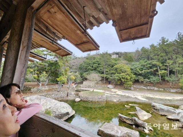 고산 윤선도가 차를 마시기 위해 바위에 홈을 파놓은 동천석실 앞 차바위. 연꽃 형상의 부용동이 한 눈에 내려다 보인다.