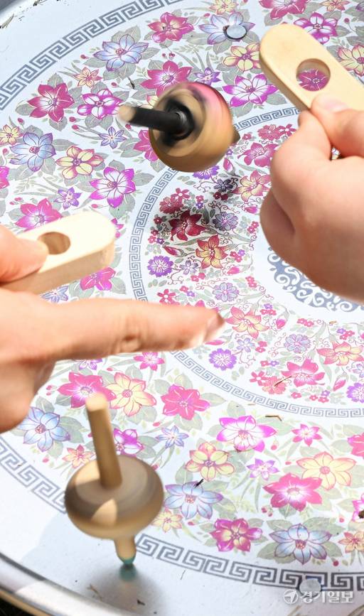 1일 '제1회 쑥골 놀림픽 - 노는동네' 행사장인 인천 미추홀구 화동근린공원에서 아이들이 즐거운 모습으로 팽이 돌리기를 하고 있다.