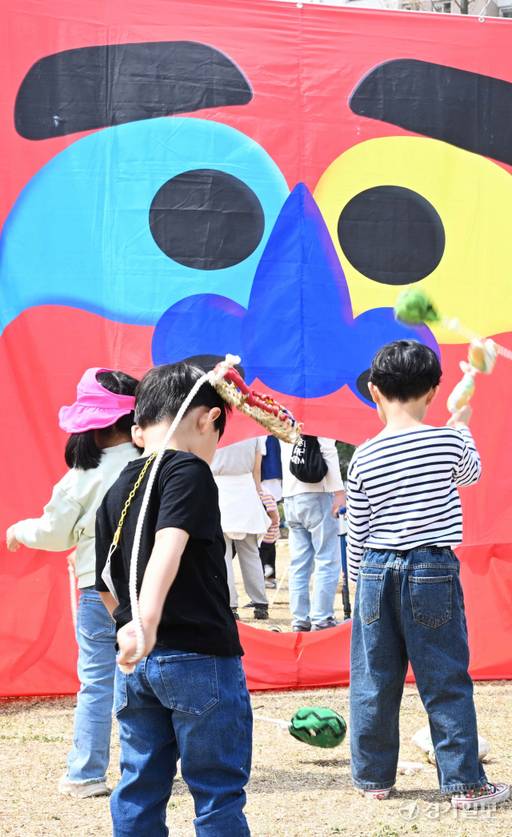 1일 '제1회 쑥골 놀림픽 - 노는동네' 행사장인 인천 미추홀구 화동근린공원에서 아이들이 즐거운 모습으로 말뚝이 투호놀이를 하고 있다.