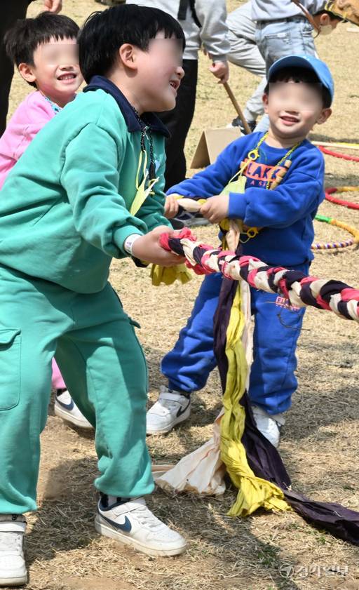 1일 '제1회 쑥골 놀림픽 - 노는동네' 행사장인 인천 미추홀구 화동근린공원에서 아이들이 즐거운 모습으로 줄다리기를 하고 있다.