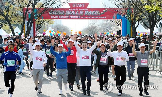 (서울=연합뉴스) 1일 오전 서울 여의도공원 문화의마당에서 증시개장 제67주년을 기념해 열린 제14회 금융투자인 마라톤 대회(Bulls Race)에서 손병두 한국거래소 이사장(앞줄 오른쪽 네 번째) 등 5km 레이스 참가자들이 출발하고 있다. 2023.4.1 [한국거래소 제공. 재판매 및 DB 금지]