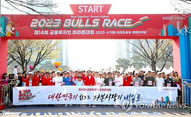 (서울=연합뉴스) 1일 오전 서울 여의도공원 문화의마당에서 증시개장 제67주년을 기념해 열린 제14회 금융투자인 마라톤 대회(Bulls Race)에서 참가자들이 출발선에서 파이팅을 외치며 기념촬영을 하고 있다. 2023.4.1 [한국거래소 제공. 재판매 및 DB 금지]