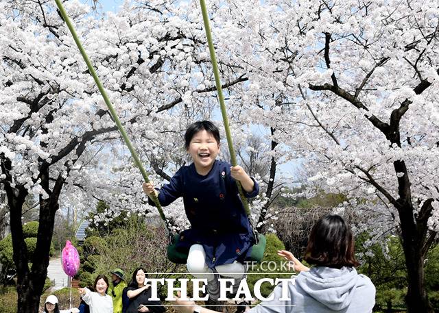 [더팩트ㅣ이새롬 기자] 완연한 봄 날씨를 보인 1일 서울 광진구 어린이대공원 동물원을 찾은 어린이가 흐드러진 벚꽃을 배경으로 그네를 타고 있다.