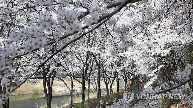 (서울=연합뉴스) 1일 경남 거창군 거창읍 건계정 산책로 벚꽃길에서 나들이객들이 산책을 하며 봄기운을 만끽하고 있다. 2023.4.1 [거창군 제공. 재판매 및 DB 금지]