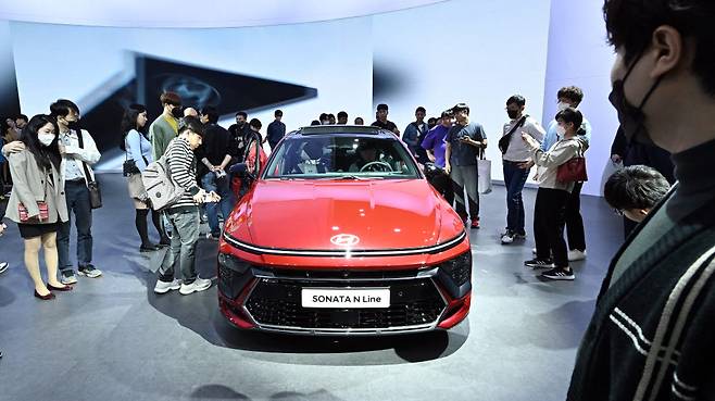 국내 최대 규모의 모빌리티 산업 전시회 '2023서울모빌리티쇼'가 '지속가능하고 지능화된 이동혁명'을 주제로 오는 9일까지 경기도 고양시 킨텍스에서 열린다. 개막 후 첫 주말인 1일 전시장을 찾은 참관객들이 현대자동차의 쏘나타 디 엣지 N라인을 살펴보고 있다.